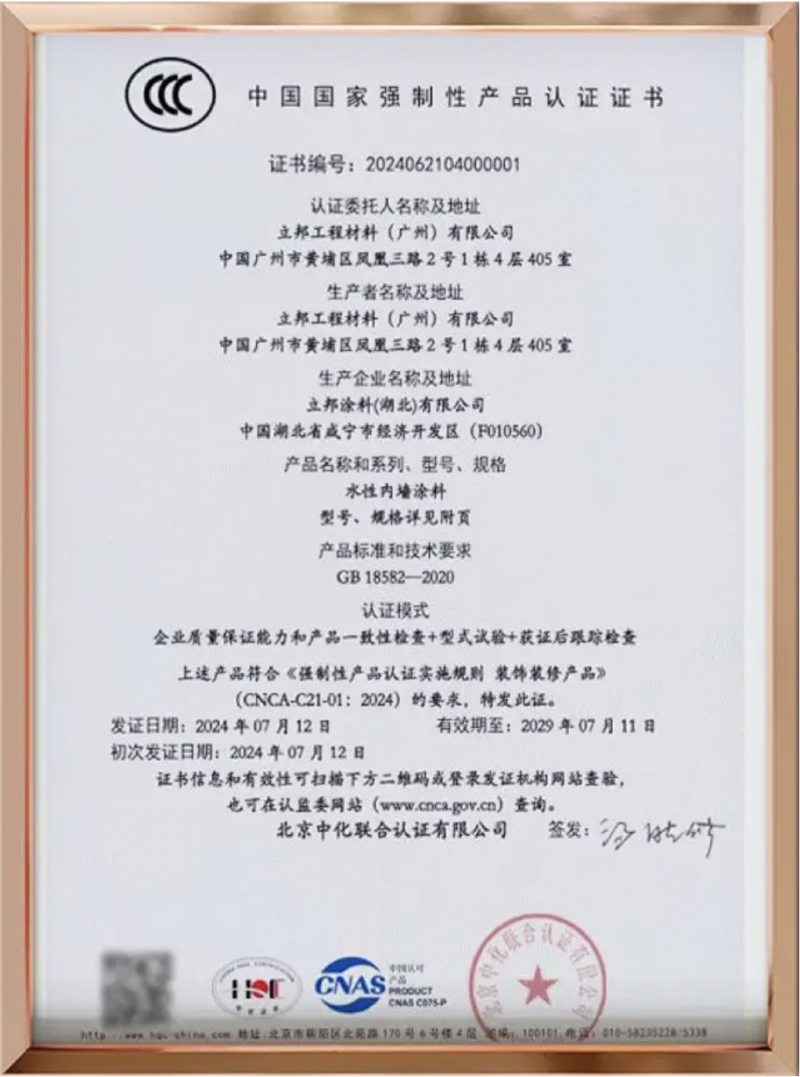 CCC認(rèn)證全稱為“中國強(qiáng)制性產(chǎn)品認(rèn)證”,是為保護(hù)消費(fèi)者人身安全,加強(qiáng)產(chǎn)品質(zhì)量管理、依照法律法規(guī)實(shí)施的一種產(chǎn)品合格評(píng)定制度。今年4月,國家市場(chǎng)監(jiān)管總局發(fā)布公告,要求自2025年7月1日起所有水性內(nèi)墻涂料在上市前需完成CCC認(rèn)證,以加強(qiáng)市場(chǎng)監(jiān)管。立邦積極響應(yīng)國家政策號(hào)召,攜手北京中化聯(lián)合認(rèn)證有限公司共同推進(jìn)認(rèn)證工作。