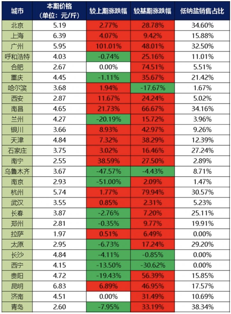 低鈉鹽銷售方面,8月份超市渠道銷售低鈉鹽占比超過15%的城市為北京、上海、廣州、重慶、南昌、石家莊、杭州、長春、鄭州、太原、貴陽、昆明、青島。