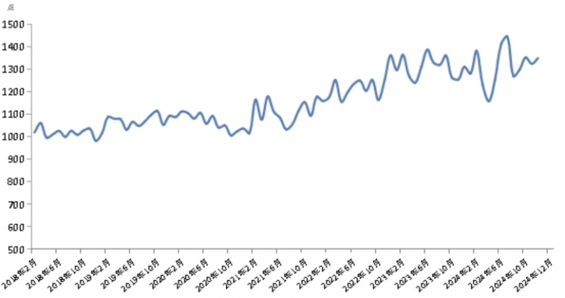 12月份,新華·中鹽食用鹽(商超)價格指數(shù)報1349.88點,較上期(2024年11月)上漲26.07點,漲幅1.97%;較基期(2018年1月)上漲349.88點,漲幅34.99%;較周期內(nèi)最高點1445.75點(2024年7月)下跌95.87點,跌幅6.79%;較周期內(nèi)最低點981.91點(2018年12月)上漲367.97點,漲幅37.47%。