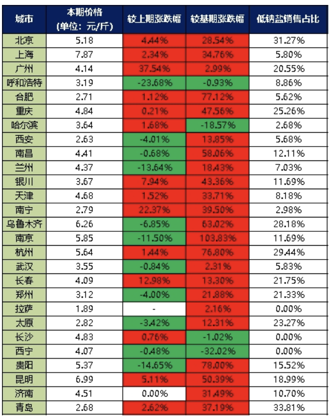 注:廣州上月(2024年11月)大潤發(fā)超市有促銷活動,故當(dāng)月(2024年12月)月內(nèi)商超食用鹽價格較上月漲幅較大。