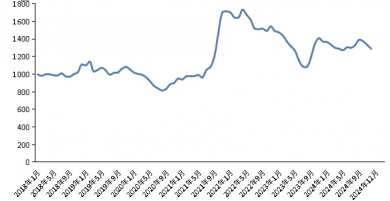 12月份,新華·中鹽兩堿工業鹽價格指數報1291.50點,較上期(2024年11月)下跌42.25點,跌幅3.17%;較基期(2018年1月)上漲291.50點,漲幅29.15%;較周期內最高點1736.66點(2022年4月)下跌445.16點,跌幅25.63%;較周期內最低點816.2點(2020年8月)上漲475.30點,漲幅58.23%。