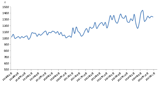 新華財經北京2月18日電(陸子琛、蔣正陽)2025年1月份,新華·中鹽食用鹽(商超)價格指數報1340.82點,較上期(2024年12月)下跌9.06點,跌幅0.67%;較基期(2018年1月)上漲340.82點,漲幅34.08%;較周期內最高點1445.75點(2024年7月)下跌104.93點,跌幅7.43%;較周期內最低點981.91點(2018年12月)上漲358.91點,漲幅36.55%。