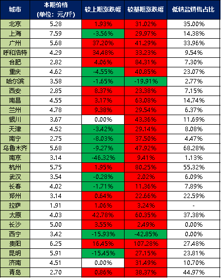 分價格區間來看,本期超市食用鹽銷售單價在5元/斤以上的城市有7個,分別是北京、上海、廣州、烏魯木齊、杭州、貴陽、昆明;超市食用鹽銷售單價在4-5元/斤之間的城市有9個,分別是呼和浩特、重慶、南昌、蘭州、天津、長春、太原、長沙、濟南;超市食用鹽銷售單價在3-4元/斤之間的城市有6個,分別是哈爾濱、銀川、南京、武漢、鄭州、西寧;超市食用鹽銷售單價在3元/斤以下的城市有5個,分別是合肥、西安、南寧、拉薩、青島。