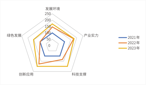 ??五項一級維度中,創新應用和科技支撐是拉動孝義氫能高質量發展指數上漲的核心“雙引擎”,漲幅領先于中國氫能高質量發展指數。其中,創新應用指數最新報200.36點,已是2021年的2倍有余,孝義氫能重卡、氫能大巴、氫能中巴、氫能裝載機、氫能公交等投運量持續增加,綜合能源站建成投運,氫能應用場景不斷豐富。在產業實力指數中,生產能力指標報256.13點,展現了地區產業鏈協同整合的發展范式。綠色發展指數改善明顯,2023年綠色發展指數報153.61點,同比漲幅近54%,在各分項指標中同比漲幅最高,產業“含綠量”提升帶動發展“含金量”。
