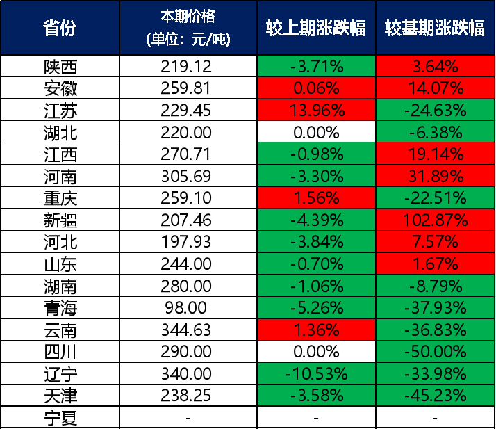 注:由于并未獲取6月寧夏相關報價,本月地方相關數據均暫以“-”替代。