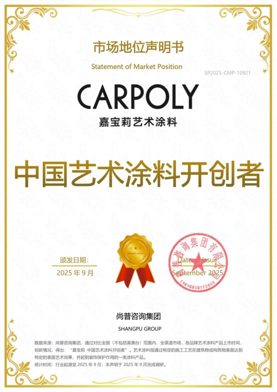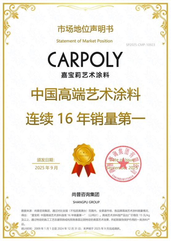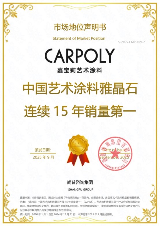 2025年9月,尚普咨詢集團向嘉寶莉頒發市場地位聲明書。此次嘉寶莉榮獲尚普咨詢【嘉寶莉 中國藝術涂料領導品牌】【嘉寶莉 中國高端藝術涂料16年連續銷量第一】【嘉寶莉 中國藝術涂料雅晶石連續15年銷量第一】【嘉寶莉 中國藝術涂料開創者】市場地位聲明,這一成績不僅彰顯了嘉寶莉在行業內的卓越地位,也為中國藝術涂料市場的發展注入了強大動力。