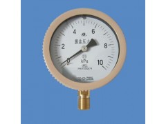 膜盒壓力表[1]采用膜盒作為測量微小壓力的敏感元件。測量對銅合金不起腐蝕作用、無爆炸危險氣體的微壓和負壓,廣泛應用于鍋爐通風、氣體管道、燃燒裝置等其他類似設備上。   不銹鋼膜盒壓力表根據導壓系統及外殼均采用不銹鋼材料制成。應用于耐腐蝕要求較高的工藝流程中對各種氣體介質的微壓和負壓的測量。   不銹鋼膜盒壓力表參照原膜盒壓力表的結構特點而研制的具有耐腐蝕作用的微壓表。應用于鍋爐通風和氣體管道等設備上,在耐腐要求較高的工藝流程中測量各種氣體介質的微壓和負壓。精確[2]度等級:2.5   結構原理:   儀表由測量系統(包括接頭、波紋膜盒等),傳動機構(包括拔桿機構,齒輪傳動機構),指示部件(包括指針與度盤)和外殼(包括表殼、襯圈和表玻璃)所組成。儀表的工作原理是基于波紋膜盒在被測介質的壓力作用下,其自由端產生相應的彈性變形,再經齒輪傳動機構的傳動并予放大,由固定于齒輪軸上的指針逐將被測值在度盤上指示出來。還有調零裝置,可以方便調整零位。   膜盒壓力表的測量范圍在-80~60000Pa,但是要根據不同的壓力量程選用不同的膜盒壓力表,壓力在-1000Pa~60000Pa時建議選用圓盤式膜盒壓力表,如果壓力在-80Pa時建議選用矩形膜盒壓力表。