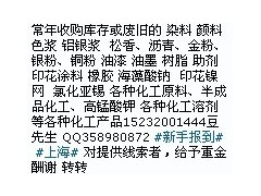 回收各種庫存廢舊積壓的化工原料、顏料類;永固、太青、耐曬、大紅粉、立索爾、中鉻、色淀、永固、色原、橡膠大紅、氧化鉻綠、三氧化二鉛、紅丹、黃丹、金粉、銀粉、珠光粉、七彩粉、鈦白粉、立德粉、R-930、氧化鐵紅、黃、等系列、色漿類、藏青、青連、紅連、化工助劑類、聚乙二醇、乙二醇、辛醇、丙酮、苯酐、順丁烯二酸酐、季戊四醇、丙烯酰胺、紅釩鉀、紅釩鈉、高錳酸鉀、苯酚、酚醛樹脂、雙酚A、水楊酸、富馬酸、五氯酚、甘氨酸、油酸、己二酸、硫脲、環(huán)氧樹脂、石油樹脂、松香改性樹脂、聚酰胺樹脂、650樹脂、T31固化劑、氧化物、氯化物、硫酸物、漂白水、硼酸、硼砂、磷酸一銨、磷酸二銨、六偏磷酸鈉、三聚磷酸鈉、亞硝酸鈉、焦磷酸鈉、焦磷酸鉀、焦亞硫酸鈉、三氯化鐵、防染鹽S、烏洛托品、硫脲、檸檬酸、酒石酸、酒石酸鉀鈉、氯化鉀、保險(xiǎn)粉、氫氧化鉀、納、片堿、雙氧水、消毒殺菌類產(chǎn)品、污水處理原料、AES、磺酸、工業(yè)鹽酸、硫酸、大、小蘇打、元明粉、硬脂酸、石蠟、氯化石蠟、各種硅油,氨基硅油,冰醋酸,異丙醇、乳化劑、OP-10、天那水、白電油、 有機(jī)顏料: 無機(jī)顏料: