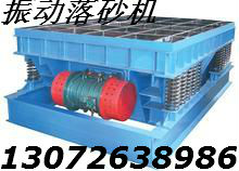 一對對稱安裝的振動電機反向同步運轉,水平方向的分力相互平衡,垂直方向的合力使落砂機的隔振質體以一定的加速度作正弦振動,同時通過共振簧使工作質體以相同頻率作正弦振動。鑄型被拋起(帶砂箱或不帶砂箱)然后下落與棚床(工作質體)碰撞,砂型與砂箱分離,鑄件與砂型分離。砂團被破碎后通過棚格孔落到回砂皮帶上。由于振動電機的合力方向與工作質體上平面垂直,所以鑄件不能自御,需起用吊設備吊離機器,完成一個鑄型落砂過程。
