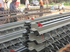 數式伸縮縫:伸縮體采用整體成型的異形鋼材制成,由邊梁、中梁、橫梁、位移控制系統、密封橡膠帶等構件組成。其特點是整體性好、抗彎抗壓強 度高,車輛經過時平穩無跳,噪聲低。適用于各種彎、坡、斜、寬橋梁。模數 式伸縮縫位移量的設計可根據實際需要按照一定模數任意組拼。 8Omm 的單縫 從 到 12OOmm 的多