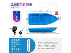 塑料船憑借著它便利、靈活、快捷、經久耐用、輕巧、浮力大、速度快、抗沖擊力強、穩定性強、安全的特點出現在大眾的視線里,越來越被人們廣泛使用。 一、產品參數 2.5米漁船 規格:長250cm 寬105cm 高38cm 配件:船槳、馬達 重量:35kg 適用行業:水產養殖、捕魚、釣魚、打撈、水上娛樂等行業 本款漁船可裝配電動馬達、配套船槳,購買整套更劃算,規格齊全,等您下單