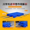 川字網格托盤共有8個鋼管槽,面4腿4。面部鋼管作用于增加動載腿部鋼管作用于上貨架。