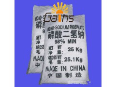 性能特點: 磷酸二氫鈉為無色斜方晶高結晶,極易溶于水,在濕空氣中易結塊,100℃時脫水成無水物。水溶液呈酸性反應。(PH=4.5)